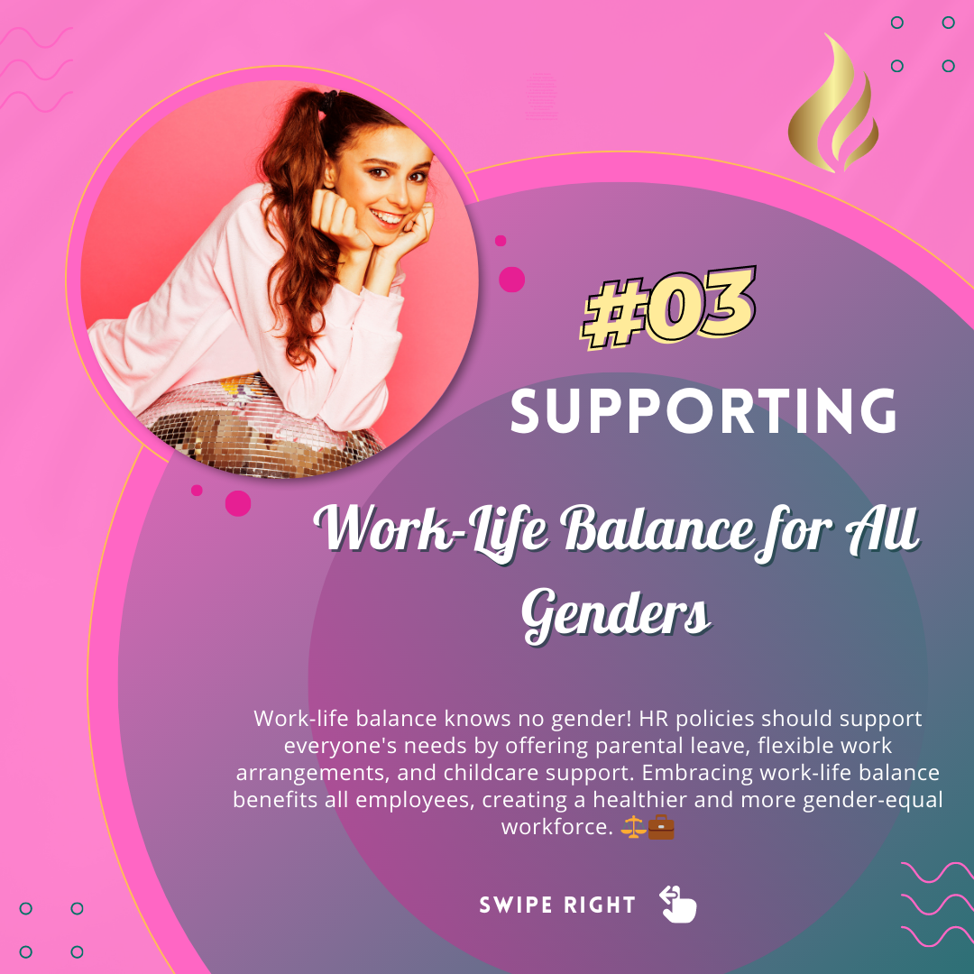 HR policies should support work-life balance for all employees, acknowledging that family responsibilities are not limited to one gender. Offering parental leave, flexible work arrangements, and childcare support benefits everyone, promoting a healthier work environment and a more gender-equal workforce.